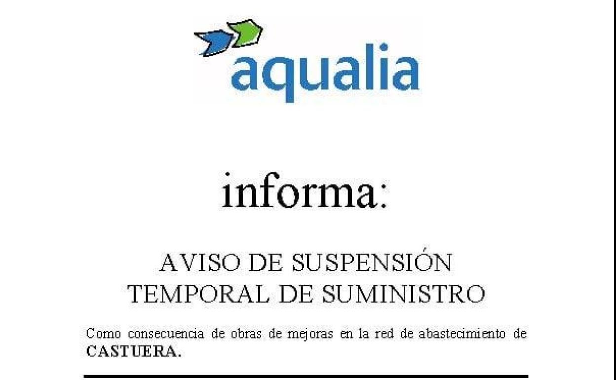 Aqualia, empresa concesionaria de la gestión integral del agua en la Mancomunidad de Municipios de La Serena, ha informado de que este miércoles, día 15 ... de septiembre, se procederá a la suspensión temporal del suministro de agua en Castuera para realizar trabajos de mejora en la red general de abastecimiento de agua potable.