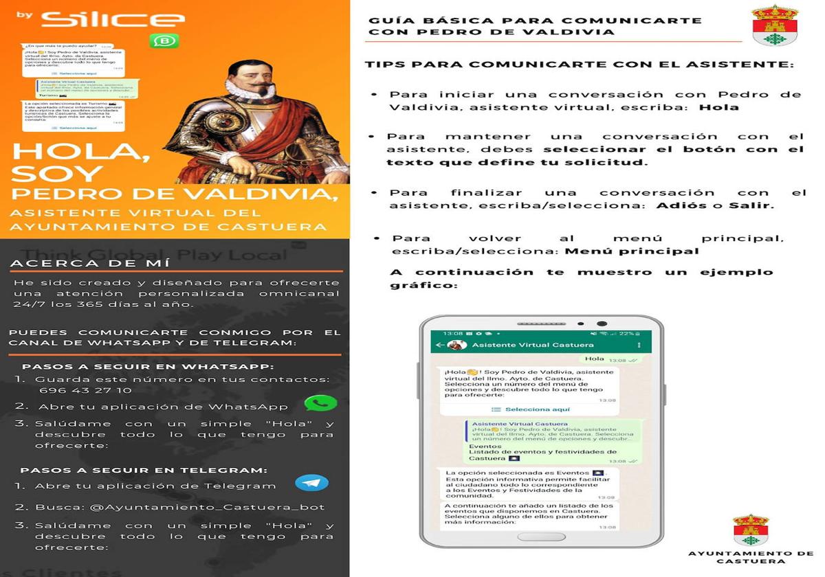 Asimismo, Martos ha explicado que para iniciar una conversación 'Pedro de Valdivia», cuyo avatar es una figura del conquistador y el escudo de Castuera, «solo hay que guardar en los contactos de teléfono el número 696432710, abrir la aplicación de WhatsApp y escribir «HOLA». A partir de ese momento ya se puede iniciar la conversación con el asistente virtual y conocer todo lo que ofrece».