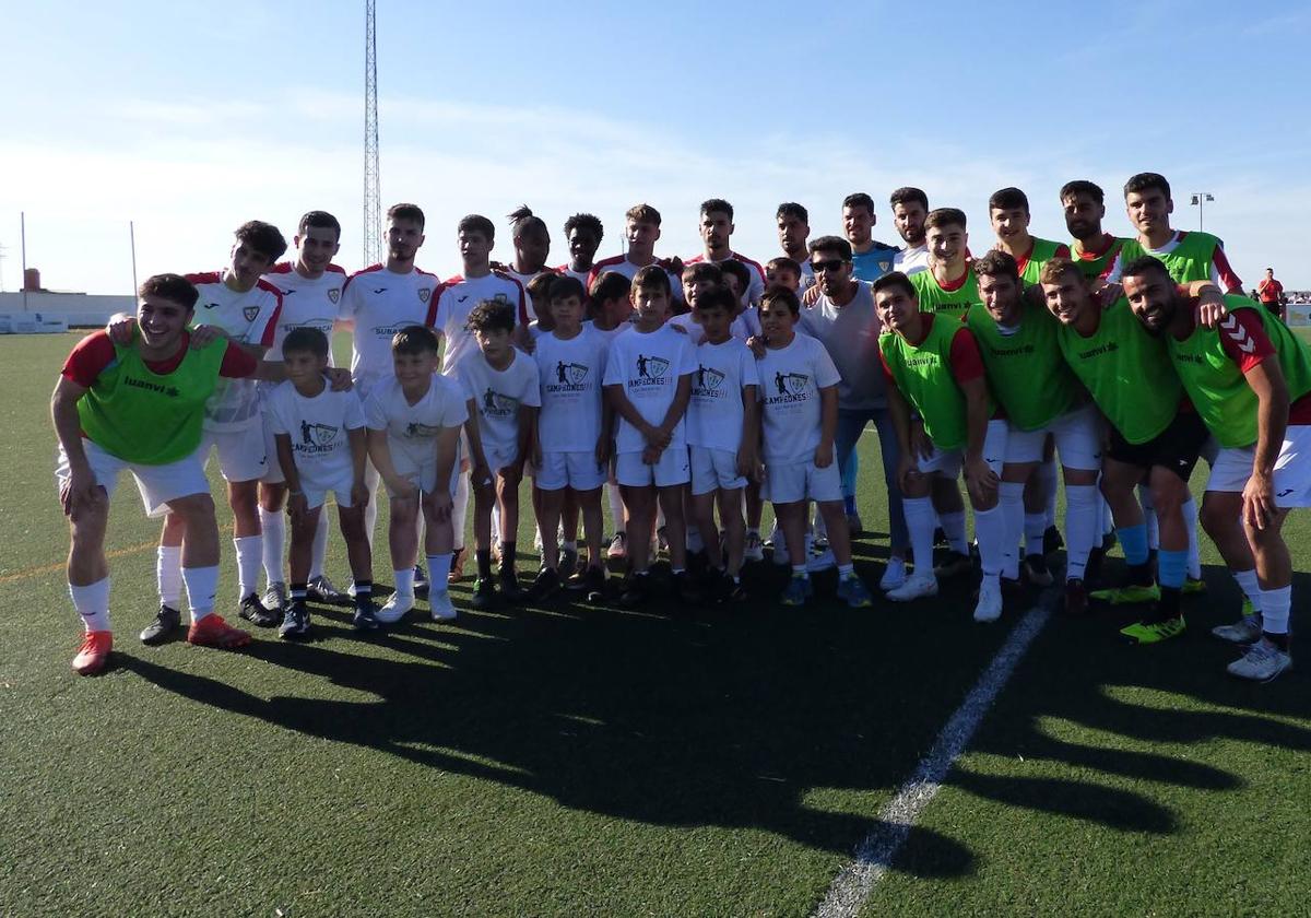 Antes de iniciarse el partido del Play-Off de ascenso que jugaron el domingo en el Manuel Ruiz los equipos del CD Castuera Subastacar y el EMD Aceuchal hicieron el pasillo a los campeones.