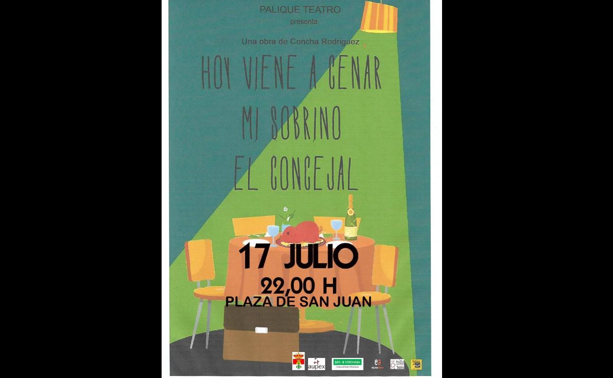 La compañía extremeña 'Palique Teatro' pone en escena este sábado, día 17 de julio, a partir de la las 22:00 horas en la Plaza de San Juan la obra 'Hoy viene a cenar mi sobrino el concejal', de la escritora Concha Rodríguez.