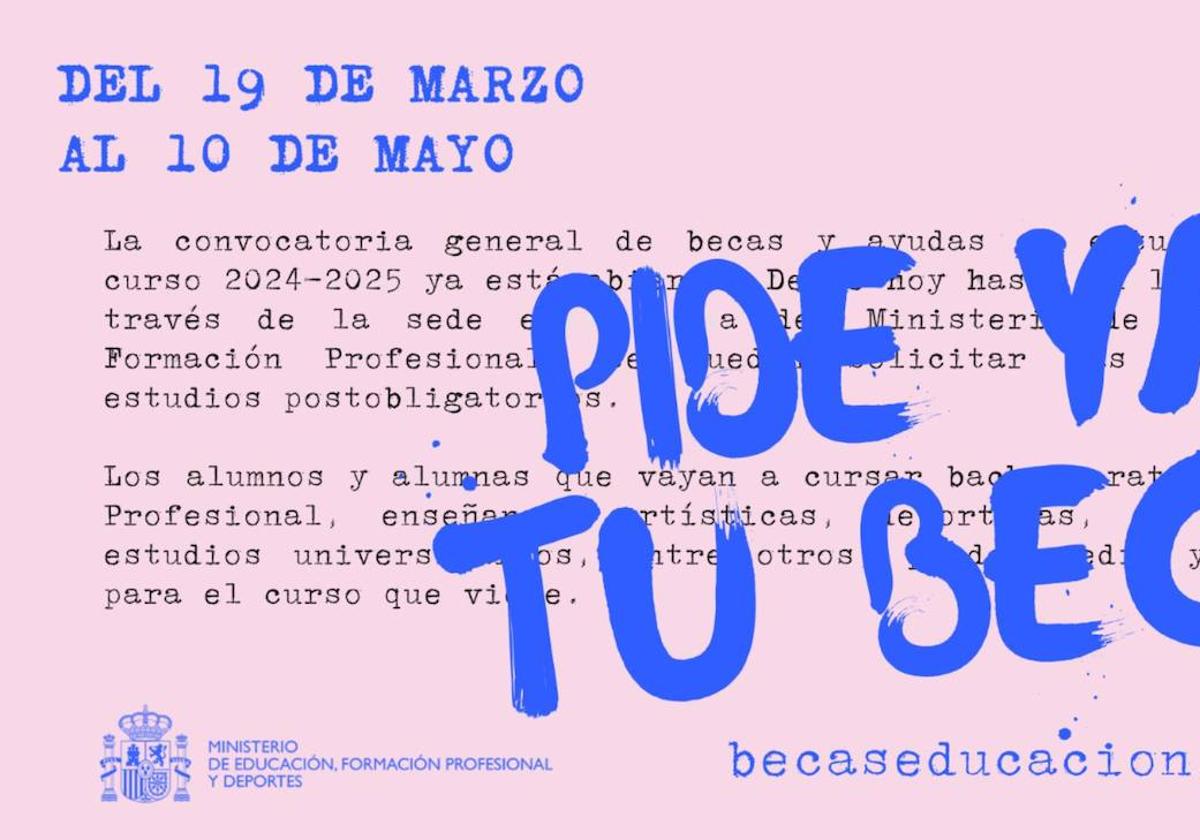 La convocatoria general de becas y ayudas al estudio para el curso 2024-2025 se abrirá el próximo martes, 19 de marzo. Las ayudas para ... estudios postobligatorios se podrán solicitar hasta el 10 de mayo a través de la sede electrónica del Ministerio de Educación, Formación Profesional y Deportes.