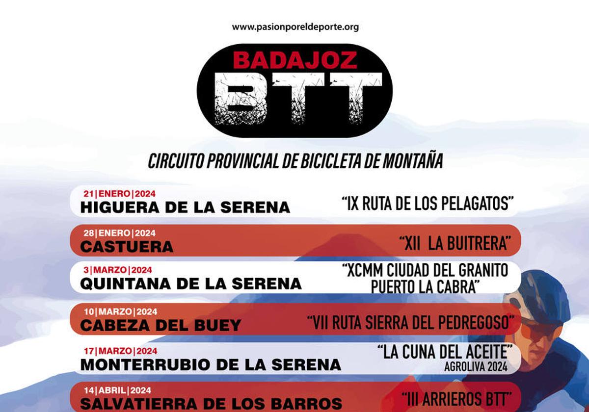 El próximo 21 de enero arranca en Higuera de la Serena la tercera edición del Circuito Provincial de Bicicleta de Montaña, BTT, que impulsa el ... Área de Cultura, Deportes y Juventud de la Diputación de Badajoz. Tal y como indica su diputado delegado, Ricardo Cabezas, «no hay mejor manera de comenzar el 2024 que presentando este circuito que desde el año 2022 forma parte del Plan de Dinamización Deportiva de la institución provincial».