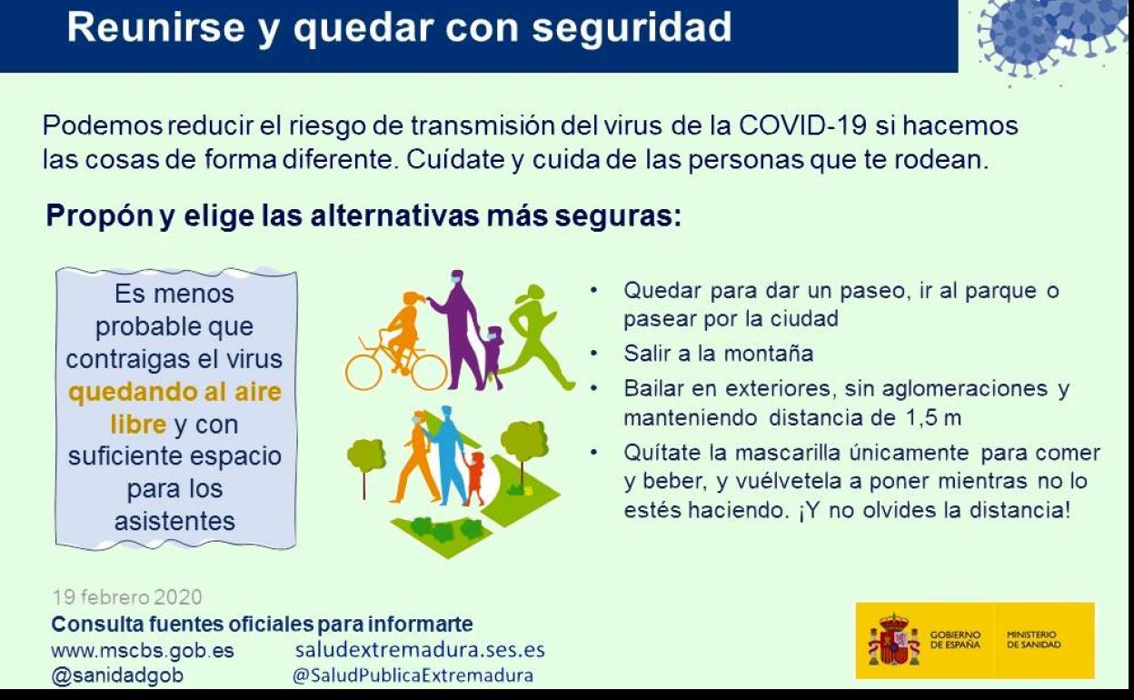 Desde Sanidad Pública se recuerda que «es de suma importancia reducir al mínimo la transmisión del virus para así disminuir el riesgo de que nos afecte y también de que el virus llegue a personas especialmente vulnerables, entre ellas, las personas mayores; (las personas jóvenes también pueden resultar afectadas de gravedad e incluso dejarles secuelas, aunque es poco frecuente».