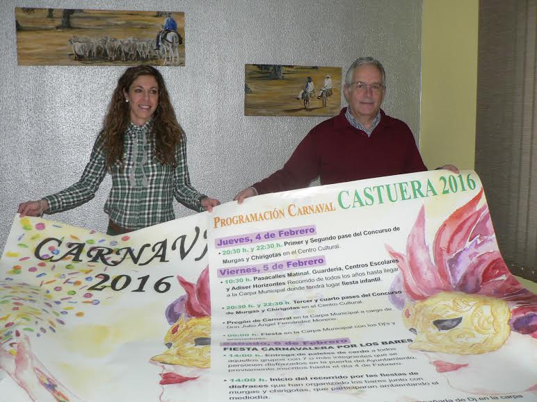 El alcalde de Castuera, Francisco Martos, y la concejala de Festejos, Mª Carmen Romero presentaron en la mañana del pasado viernes 29 de enero el programa de actos y actividades del Carnaval 2016, que este año se celebrará del 4 al 7 de febrero.