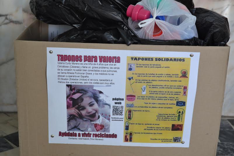 Diferentes puntos en la localidad recoge tapones solidarios para salvar la vida de Valeria