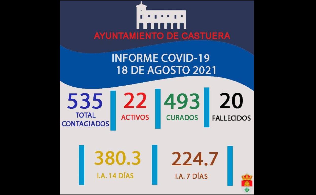 Respecto al informe epidemiológico con los datos cerrados por Sanidad Pública el miércoles 18 de agosto a las 17:00 horas, Martos informa que desde que concluyó el estado de alarma el día 21 de junio de pasado año 2021, en Castuera se han confirmado 535 positivos de Covid-19. De ellos 493 personas ya han superado la enfermedad y se consideran curadas, 20 figuran en la lista de fallecidos y 22 permanecen con el virus activo. La Incidencia acumulada en 14 días es 380,3 casos por cada 100.000 habitantes, y en 7 días de 224,7 casos por cada 100.000 habitantes.