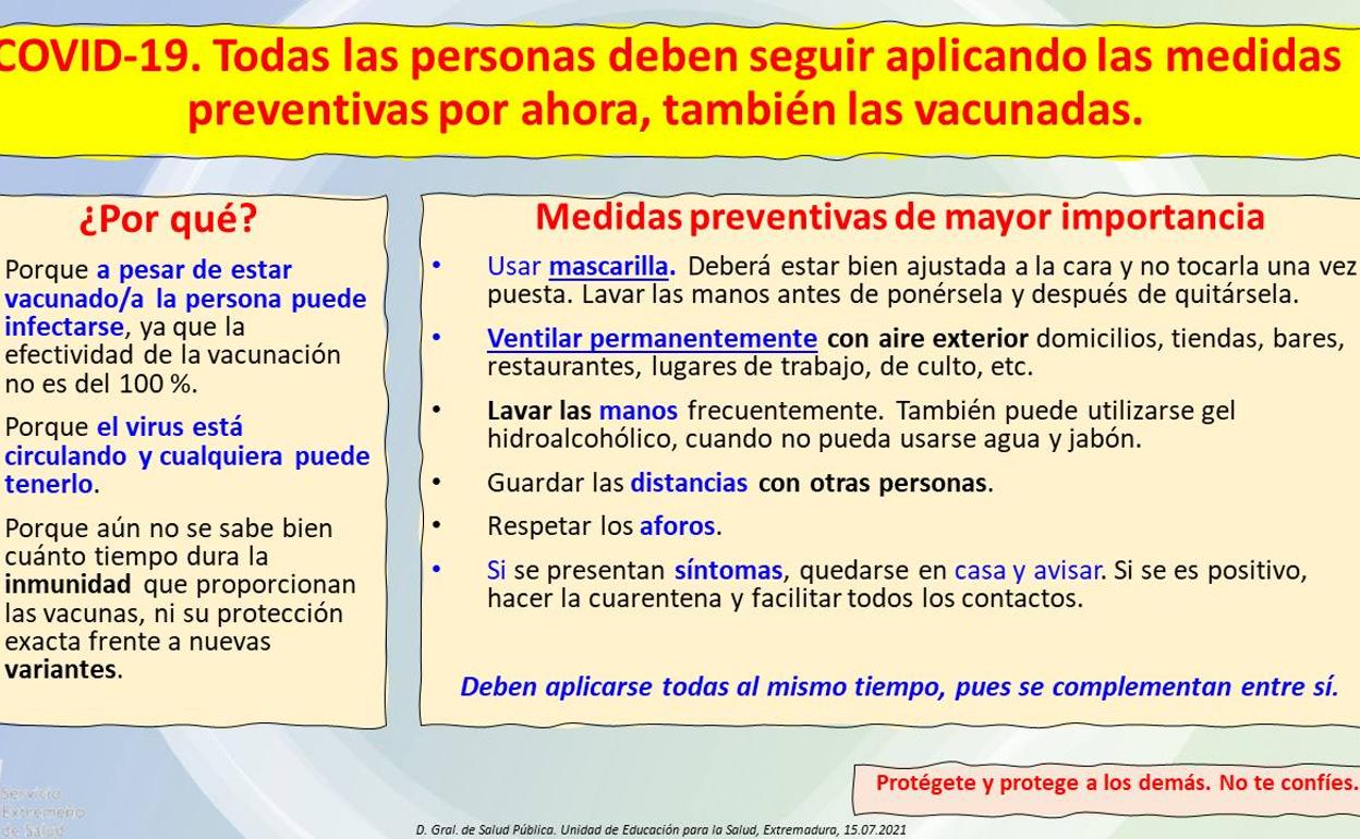 Desde Sanidad Pública se recuerda que «es de suma importancia reducir al mínimo la transmisión del virus para así disminuir el riesgo de que nos afecte y también de que el virus llegue a personas especialmente vulnerables, entre ellas, las personas mayores (las personas jóvenes también pueden resultar afectadas de gravedad e incluso dejarles secuelas, aunque es poco frecuente)«.