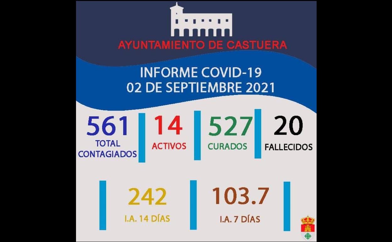 Respecto al informe epidemiológico con los datos cerrados por Sanidad Pública el jueves 2 de septiembre a las 16:38 horas, Martos informa que desde que concluyó el estado de alarma el día 21 de junio de pasado año 2021, en Castuera se han confirmado 561 positivos de Covid-19. De ellos 527 personas ya han superado la enfermedad y se consideran curadas, 20 figuran en la lista de fallecidos y 14 permanecen con el virus activo. La Incidencia acumulada en 14 días es 242 casos por cada 100.000 habitantes, y en 7 días de 103,7 casos por cada 100.000 habitantes.