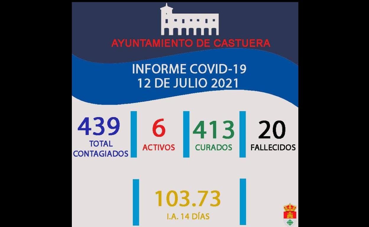 Respecto al informe epidemiológico con los datos cerrados por Sanidad Pública a las 17:05 horas de este lunes 12 de julio, Martos ha informado que desde que concluyó el estado de alarma el día 21 del mes de junio del pasado año, en Castuera se han confirmado 439 contagios de Covid-19. De ellos 413 personas ya han superado la enfermedad y se consideran curadas, 20 figuran en la lista de fallecidos y 6 permanece con el virus activo. La Incidencia acumulada en 14 días es 103,73 casos por cada 100.000 habitantes.