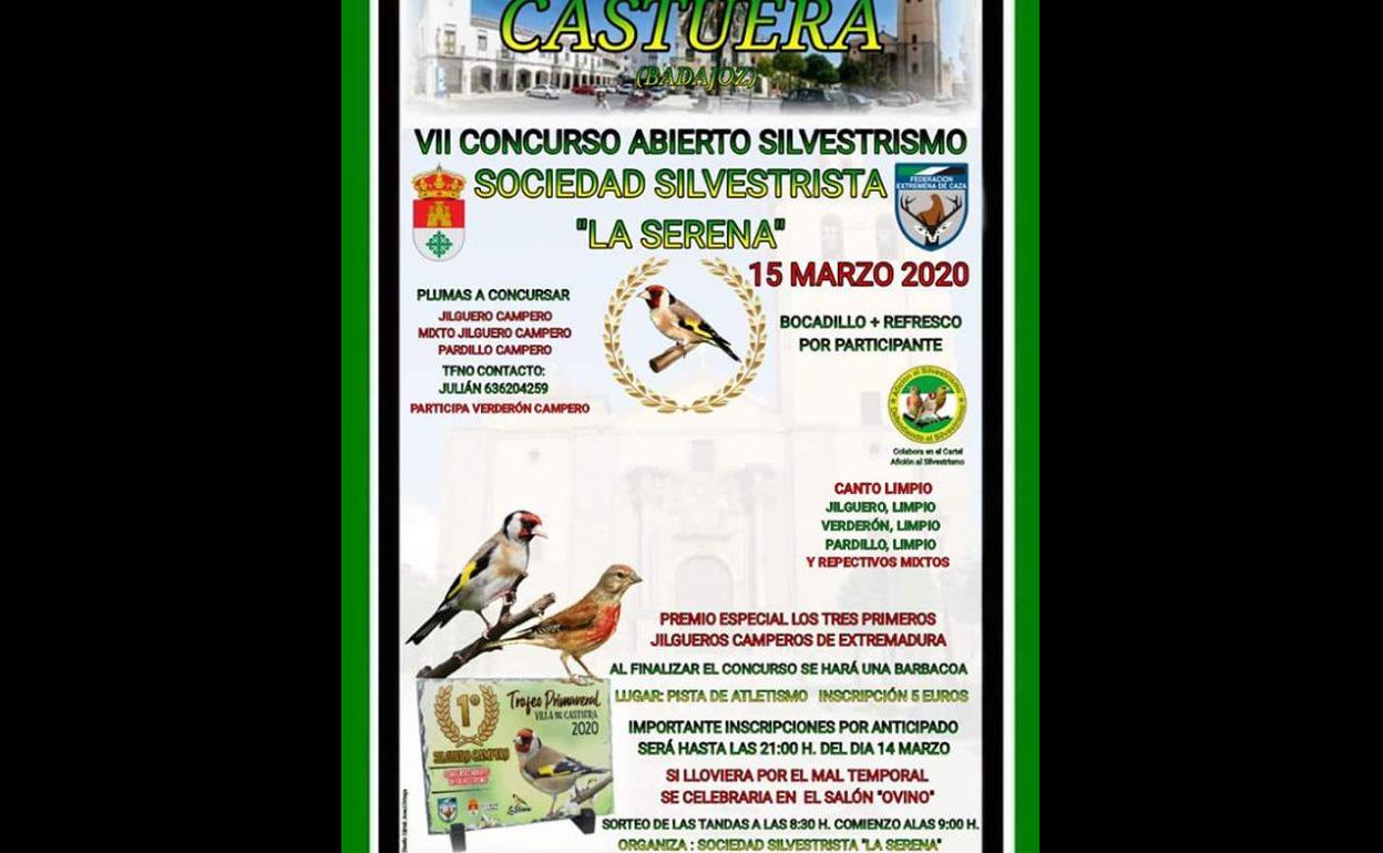Se concederá el Trofeo Primaveral Villa de Castuera 2020 y premio especial a los tres primeros Jilgueros Camperos de Extremadura.
