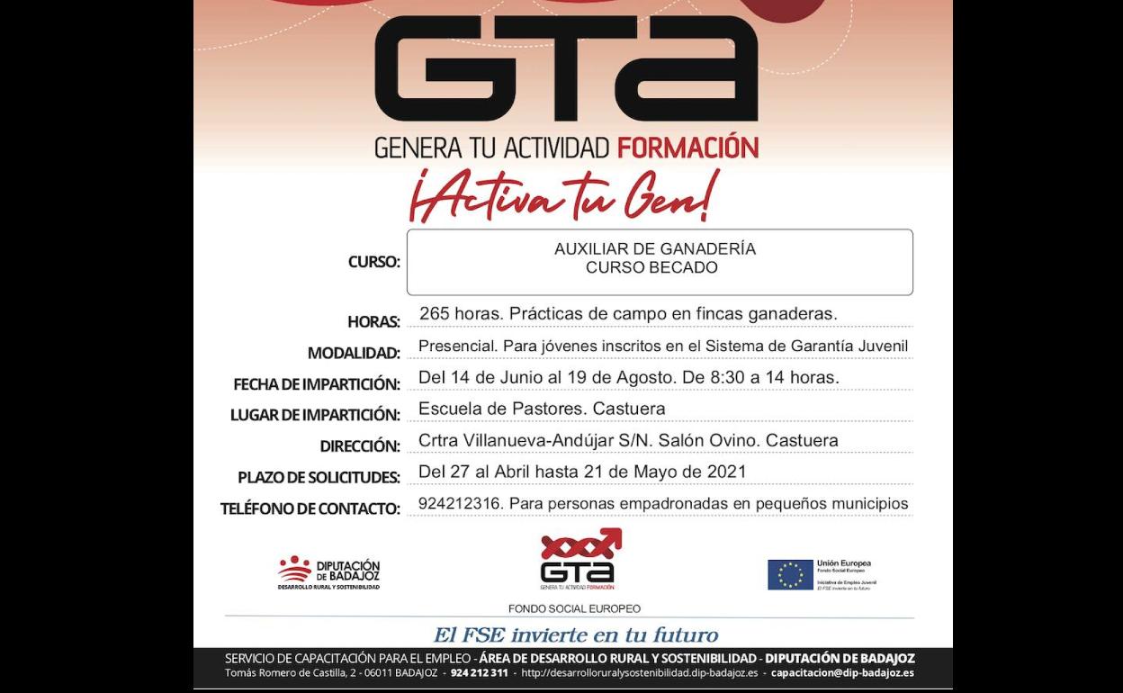 El próximo viernes 21 de mayo es la fecha tope para inscribirse el curso de 'auxiliar de ganadería', ofertado por Diputación de Badajoz. Esta acción formativa está dirigida a personas jóvenes mayores de 16 y menores de 30 años, incluidas las personas con discapacidad o no, en situación de desempleo e inscritos en el Sexpe y no integradas en los sistemas de educación o formación, independientemente de su nivel formativo, que estén inscritas en el Programa de Garantía Juvenil y residentes en municipios de la provincia de Badajoz menores de 5.000 habitantes, o en municipios mayores de 5.000 o menores de 10.000 habitantes con crecimiento vegetativo negativo.